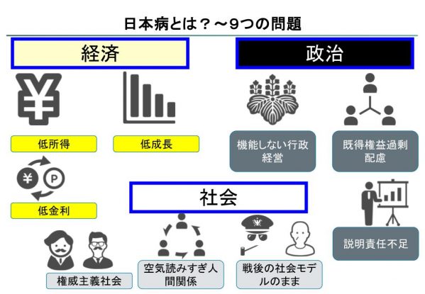 「社会の医者」こと筆者西村健は、「日本病」として9つの問題を提示しています。経済の「日本病」と言われる、「低所得」「低成長」「低金利」の問題だけでなく、