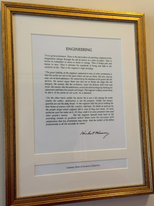 “It is a great profession. There is the fascination of watching a figment of the imagination emerge through the aid of science to a plan on paper. Then it moves to realization in stone or metal or energy. Then it brings jobs and homes to men. Then it elevates the standards of living and adds to the comforts of life. That is the engineer’s high privilege.