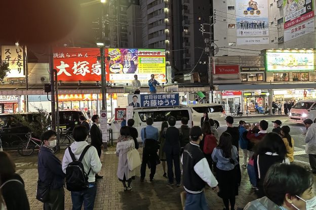 .政治 japanindepth編集部, コロナ, ミカン下北, 三軒茶屋, 下北沢, 世田谷区, 世田谷区長選, 保坂展人, 内藤ゆうや, 区庁舎, 子育て, 安倍宏行, 日本維新の会, 社民, 統一地方選, 維新, 自民, 馬場伸幸
